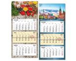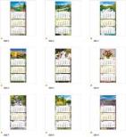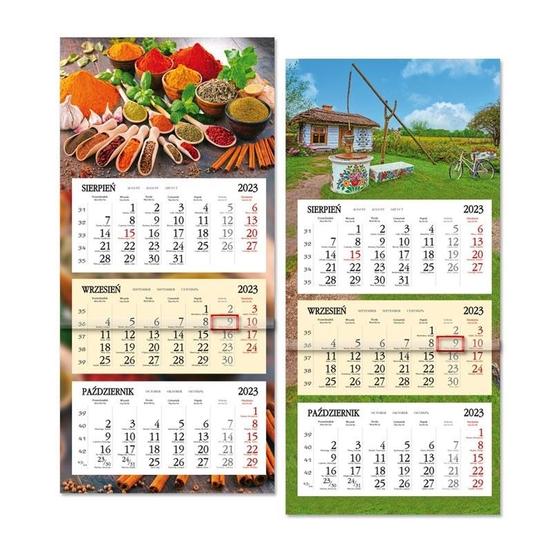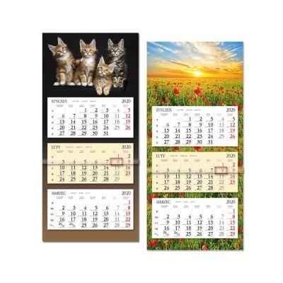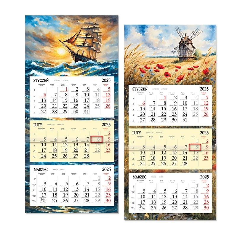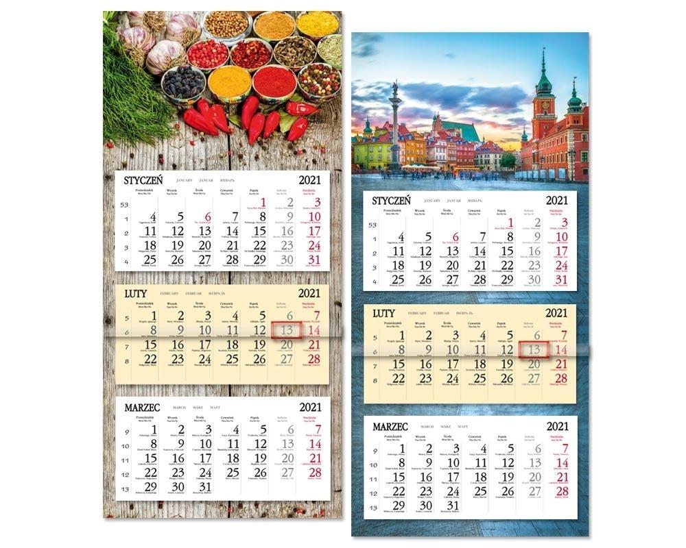 Format kalendarza - 75 x 31,5 cm, główki - 20 x 31,5 cm kalendarium - 14 x 29 cm, nadruku reklamowego - 5 x 31,5 cm Układ 3 oddzielne kalendaria, miesiąc poprzedni, bieżący wyróżniony kolorystycznie i następny Druk, Papier główka płaska - karton 350 g/m2 + folia 8 zdjęć tematycznych, możliwość wykonania indywidualnej główki kalendarium - offset 70 g/m2, 2 kolory plecki - karton biały 400 g/m2 Kalendarium w języku polskim, angielskim, niemieckim, rosyjskim, podwójne imieniny, numeracja tygodni, pasek z okienkiem