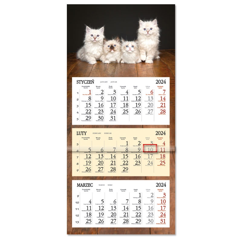 - Kalendarium: w języku polskim, angielskim, niemieckim, rosyjskim, numeracja dni i tygodni, wschody i zachody słońca, potrójne imieniny, perforacja narożników