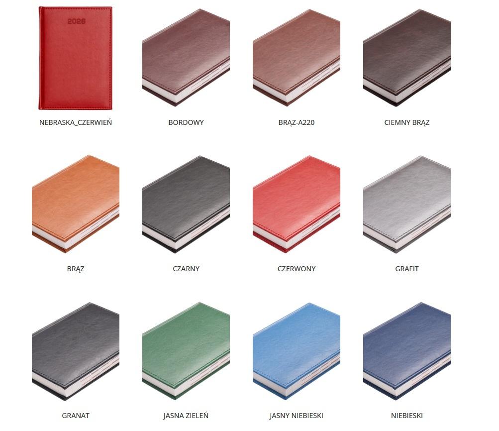 Kolor okładkiczarny, granat, niebieski, jasny niebieski, ciemny brąz, brąz, jasny brąz, bordo, zieleń, jasna zieleń, czerwony, pomarańcz, grafit, turkus Powyżej 50 szt. dostępne kolory: pomarańcz.