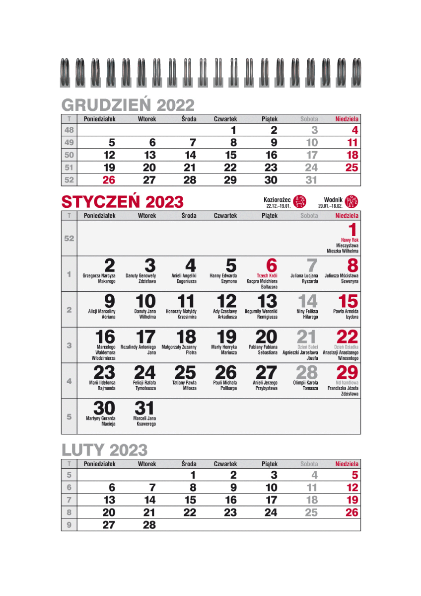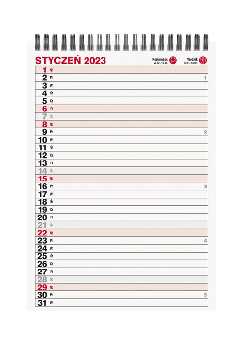 Kalendarz biurkowy Pionowy TRÓJDZIELNY, format 145/210 mm, papier offsetowy, okładka papier kredowy, 26 stron, układ kalendarium w stylu kalendarza trójdzielnego (z drugiej strony miejsce na notatki na każdy dzień) oprawa spirala na podstawie kartonowej, kalendarz zawiera imieniny, nazwy świąt, numeracja tygodni, znaki zodiaku, wschody/zachody Słońca.