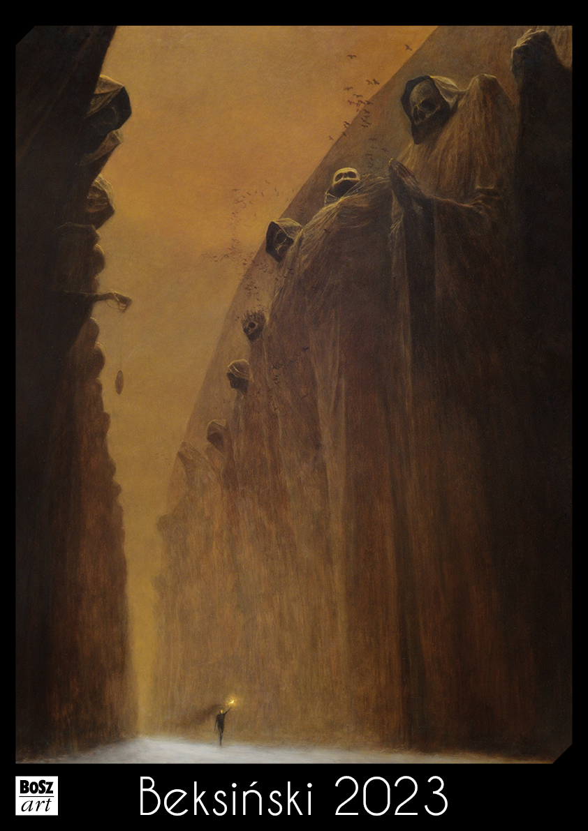 Kalendarz 13-kartkowy na 2023 rok z 12 ilustracjami prac Zdzisława Beksińskiego w formacie A3 (420x297 mm) wydrukowany na kredowym papierze o gramaturze 170g.