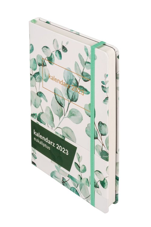 • Kolekcja: Eukaliptus • Format: A5 • Wymiary okładki: 210x144 mm • Układ: dzień na stronie • Ilość stron: 352 • Oprawa: twarda • Materiał: papier • Gramatura papieru: 80g • Kolor papieru: chamoise • Dodatki: plan roku 2023, ważne wydarzenia, skorowidz adresowy, notatki • Pionowa gumka zamykająca: zielona • Wstążka: zielona • Gumka na długopis: nie • Zaokrąglone rogi: tak • Wyklejka: czarna • Koperta: nie