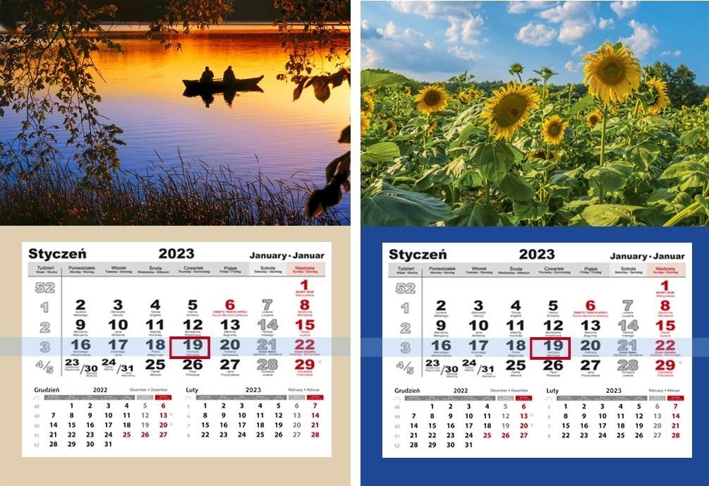 Kalendarz jednodzielny to funkcjonalny typ kalendarza biurowego. Czytelne, jednokartkowe kalendarium eksponuje miesiąc bieżący, a poniżej w mniejszej skali, miesiące poprzedni i następny.