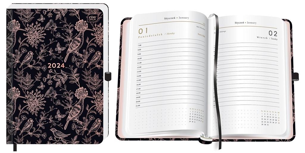 Format A5. Liczba stron: 384. Zaokrąglone rogi. Okładka z modnym metalicznym efektem. W środku kolorowa wyklejka. Twarda oprawa skutecznie chroni zawartość przed zniszczeniem. Kalendarz w układzie dzień na stronie z podziałem na godziny pozwala na szczegółowe zaplanowanie każdego dnia. Wyposażony w praktyczne dodatki: tasiemkę do zaznaczania strony i pętelkę na długopis. W środku także: adresówka, praktyczne kalendarium oraz miejsce na dodatkowe notatki.