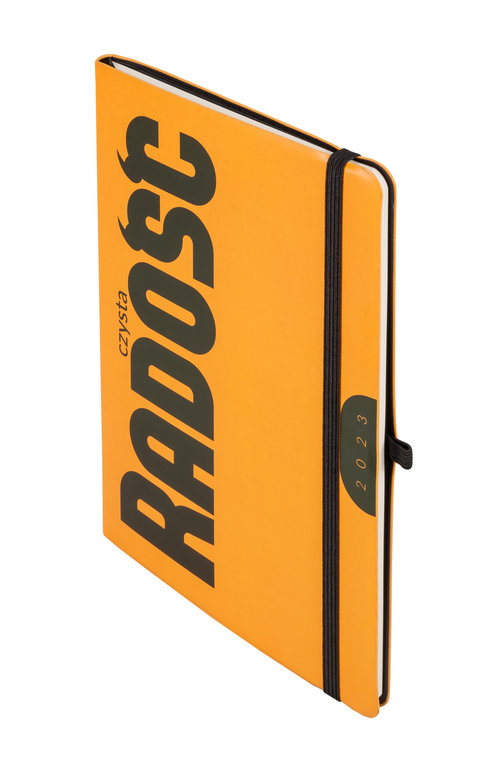 format: A5, wymiary okładki: 210x145 mm, układ: tydzień do wglądu, Ilość stron: 144, oprawa: miękka, materiał: skóra ekologiczna z nadrukiem, gramatura papieru: 80g, kolor papieru: off white, dodatki: plan roku 2023, ważne wydarzenia, skorowidz adresowy, notatki, pionowa gumka zamykająca: czarna, wstążka: czarna, gumka na długopis: czarna, zaokrąglone rogi: tak, wyklejka: czarna, koperta: tak, dostępne kolory: pomarańczowy