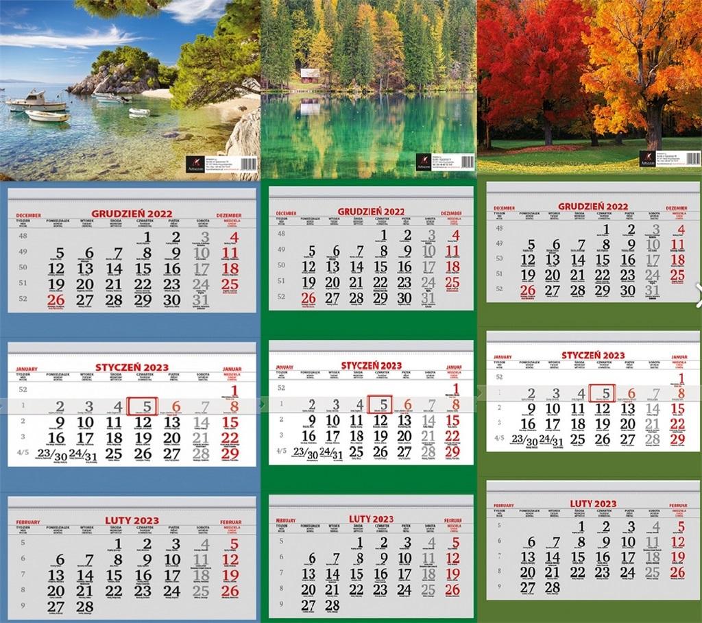 KALENDARZ TRÓJDZIELNY LUX dostępny w 24 wzorach, 3 oddzielne, miesięczne