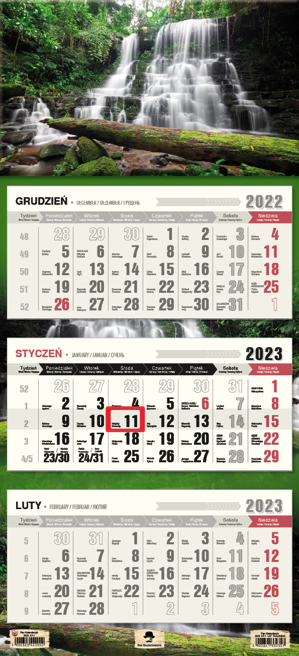 Kalendarz trójdzielny z płaską główką, format 315/680mm, główka z otworem wierconym, klasyczny układ trzech kalendariów z przesuwanym okienkiem, kalendarium wyraźne i czytelne z dużymi cyframi, posiada miejsce do notowania, dodatkowo nazwy miesięcy i dni tygodnia w języku Angielskim, Niemieckim i Ukraińskim.