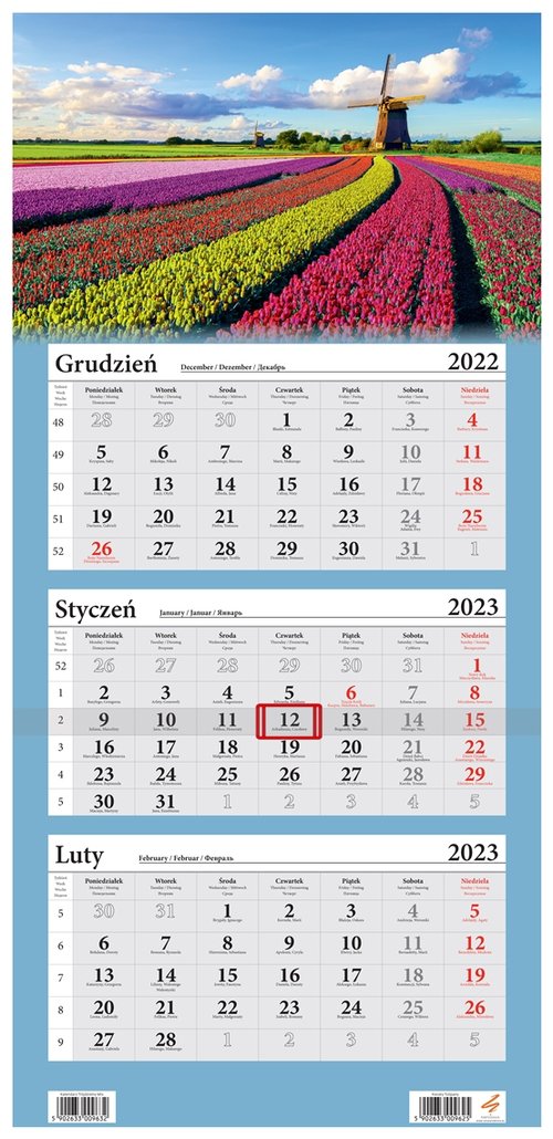 Klasyczny kalendarz ścienny trójdzielny na 2023. Jest to kalendarz wiszący, podłużny, z opaską z przesuwnym okienkiem do zaznaczenia obecnego dnia. Kalendarz można złożyć w 3 miejscach. Zawiera 3 odrębne, zrywane kalendaria każde po 12 kartek. Sposób zawieszania - otwór w górnej części. Kalendarz został wyprodukowany w Polsce. Wymiary po rozłożeniu 32 x 67,5 cm.