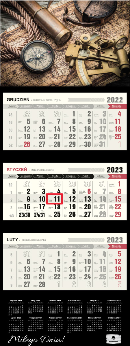 Kalendarz trójdzielny PREMIUM z wypukłą główką, format 315/810 mm, główka z otworem wierconym, klasyczny układ trzech kalendariów z przesuwanym okienkiem, kalendarium wyraźne i czytelne z dużymi cyframi, posiada miejsce do notowania, dodatkowo nazwy miesięcy i dni tygodnia w języku EN, DE, UA, dodatkowo przedłużone plecki ze skróconym kalendarium na 2023 rok.