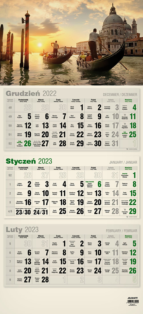 KTT EKO – Kalendarz Trójdzielny Płaski EKO (drukowany na ekologicznym papierze typu Kraft), format 310x682 mm, główka płaska. KTT EKO to prawdziwa ozdoba wnętrza. Trzy kalendaria miesięczne zawierają oznaczenia miesięcy i dni tygodnia w trzech językach (PL, EN, DE) oraz imieniny i typowe święta. Mix wzorów - wysyłane losowo