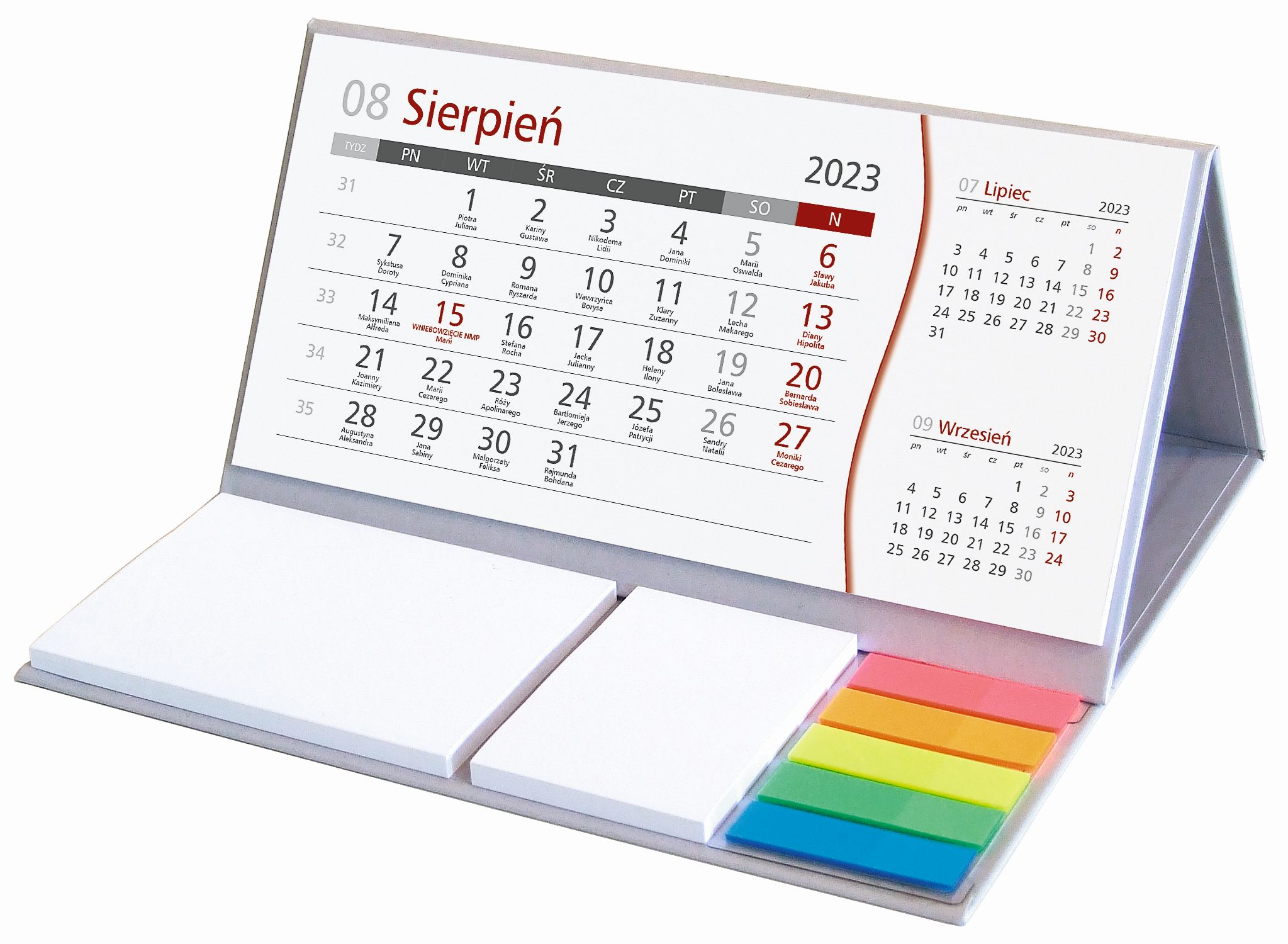 Kalendarz biurkowy z notesem i kolorowymi znacznikami. Format kalendarza 210x192x112 mm. Kalendarium w formacie 204x99 mm. Druk kalendarium szaro-bordowy. Podstawka w kolorze szarym.
