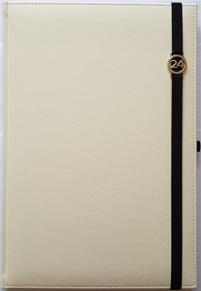 Miękka, przyjemna w dotyku oprawa z materiału pokryciowego Nebraska w kolorze białym. Okładka zamykana na czarną gumkę, posiada gumkę na długopis. Drukowany na białym papierze; bloki terminarza szyte nićmi; kapitałka i tasiemka białe; przejrzysty układ graficzny kalendarium; rozbudowana część informacyjna; oprawa umożliwia wykonanie nadruków, tłoczenia i personalizacji kalendarza.