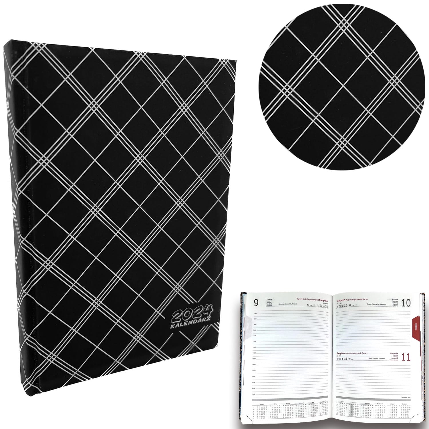 "kalendarz formatu A5, układ dzienny, okładka aksamitna soft touch, papier biały
