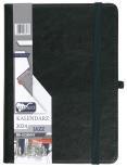 wewnątrz: plan roku i rozkład roku 2024, terminy ferii zimowych, święta oficjalne i zwyczajowe, podróże, informacje dla podróżnych, protokół powypadkowy w przypadku stłuczki, notes, skorowidz teleadresowy, kalendarium dodatkowe na 2023-2024-2025 rok