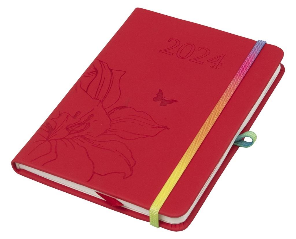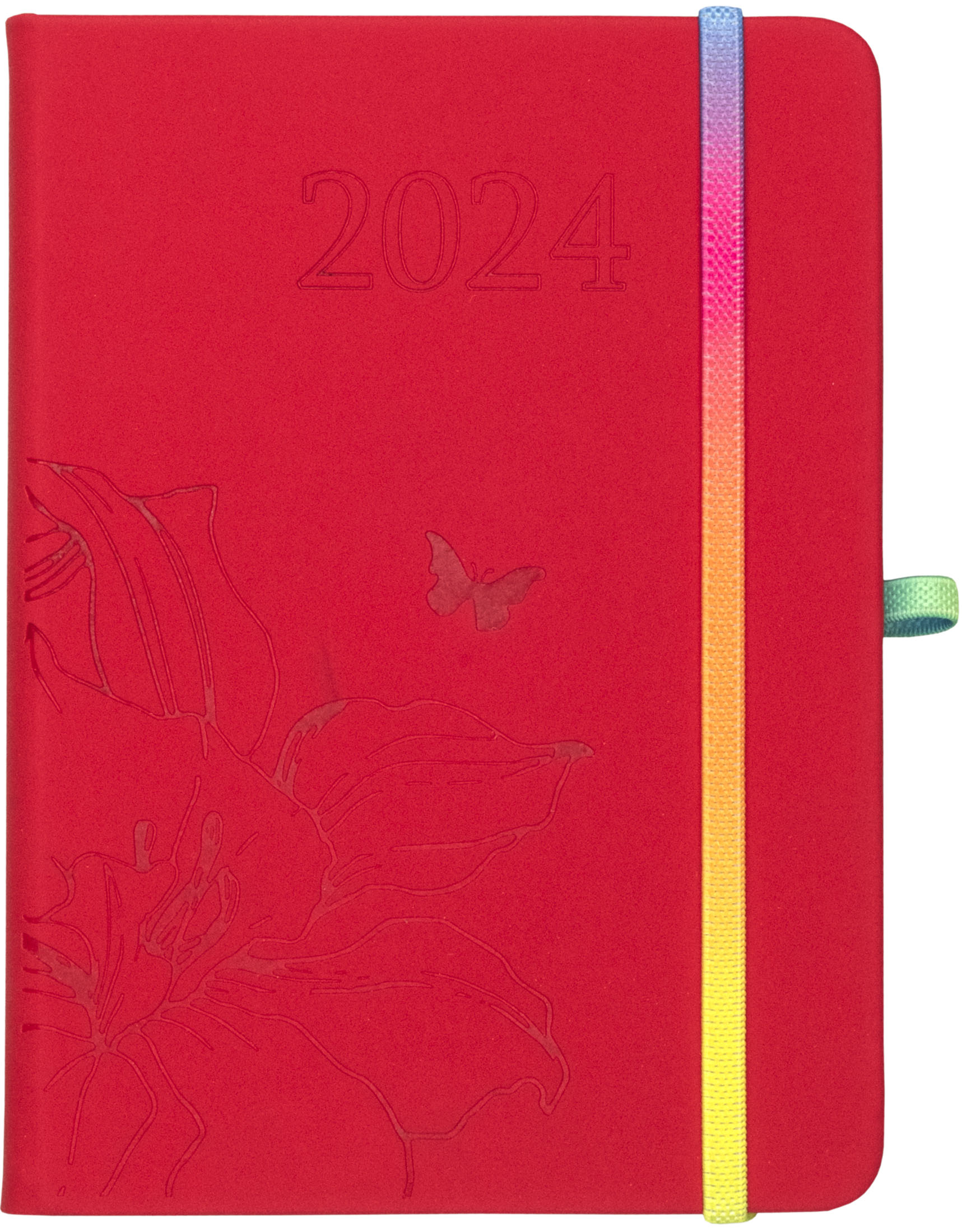 • wewnątrz: plan roku i rozkład roku 2024, terminy ferii zimowych, święta oficjalne i zwyczajowe, protokół powypadkowy w przypadku stłuczki, notes, skorowidz teleadresowy, kalendarium dodatkowe na 2023-2024-2025 rok