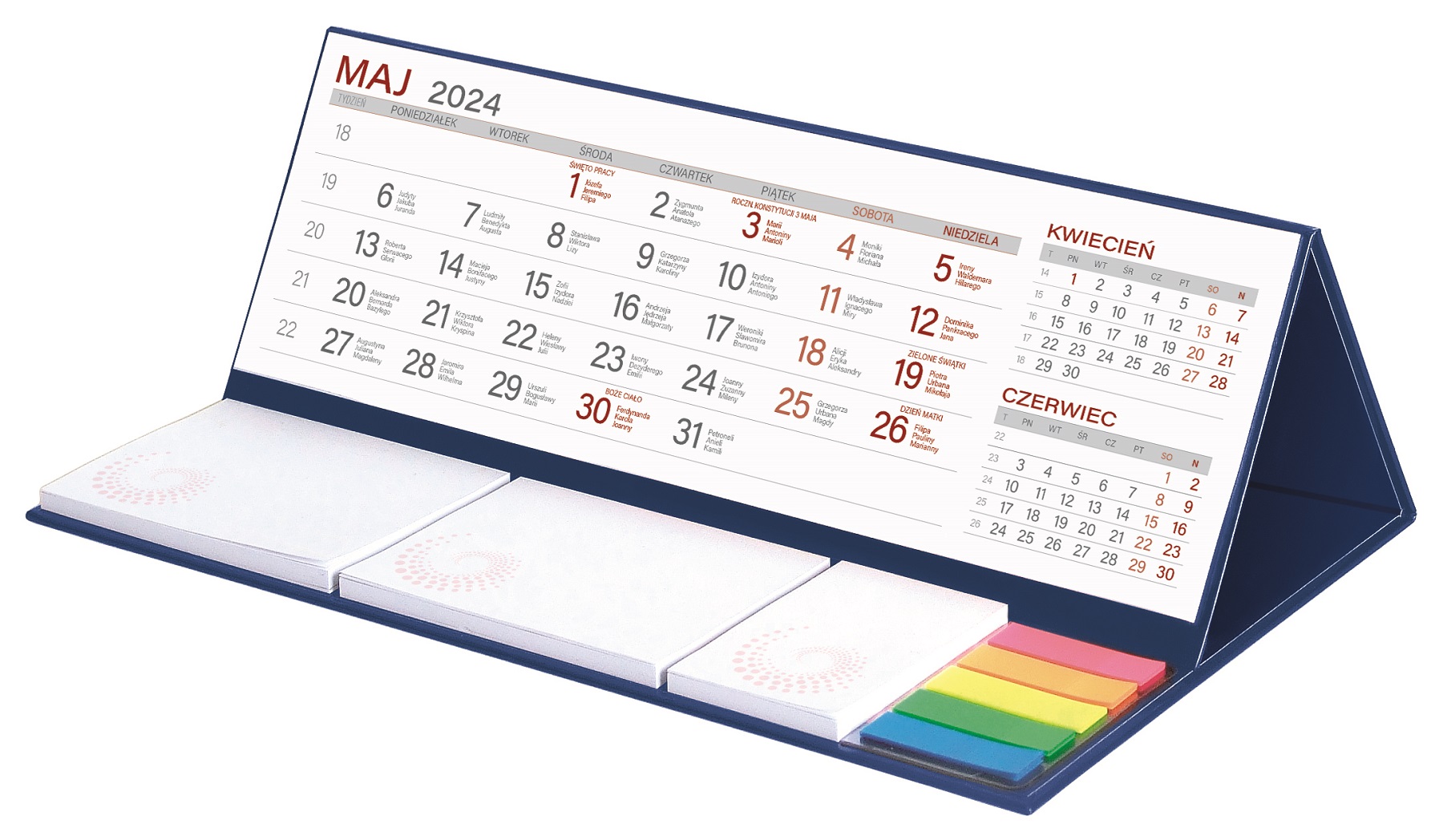 Wygodny kalendarz stojący na biurko z przejrzystym kalendarium w układzie trójdzielnym z poręcznymi karteczkami samoprzylepnymi do notowania. Przydatny zwłaszcza w biurze. W kalendarzu zaznaczono święta i daty imienin. Na tylnej części kalendarza istnieje możliwość wykonania nadruku reklamowego na obszarze o wymiarach 305 x 100 mm.