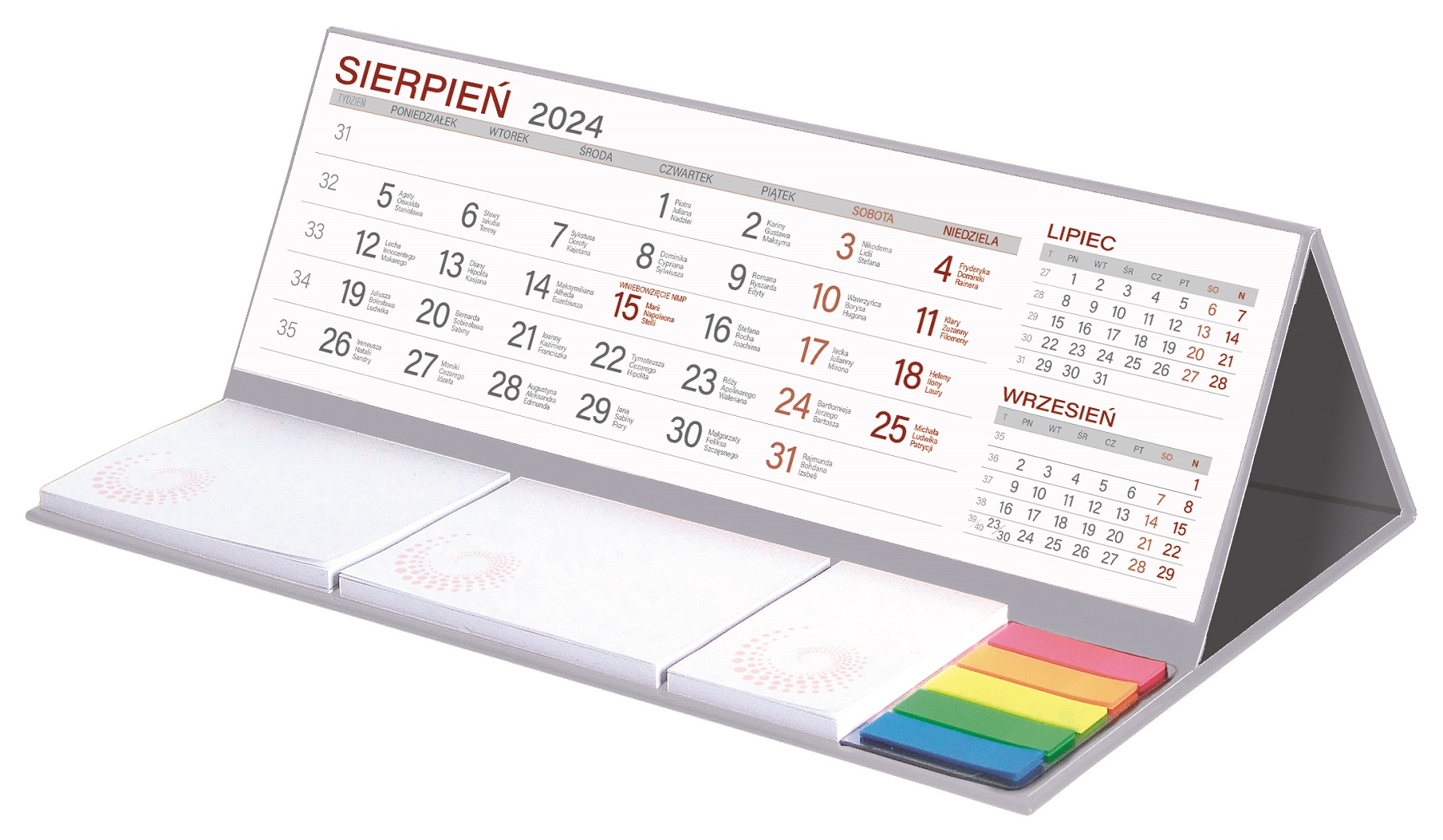 Wygodny kalendarz stojący na biurko z przejrzystym kalendarium w układzie trójdzielnym z poręcznymi karteczkami samoprzylepnymi do notowania. Przydatny zwłaszcza w biurze. W kalendarzu zaznaczono święta i daty imienin. Na tylnej części kalendarza istnieje możliwość wykonania nadruku reklamowego na obszarze o wymiarach 305 x 100 mm.
