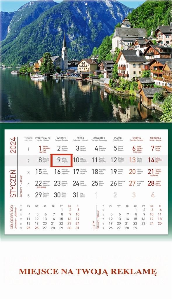 Kalendarz jednodzielny wiszący ścienny z kalendarium w układzie trzymiesięcznym z ozdobną główką, wypukłą i lakierowaną. Kalendarz jest składany do formatu A4. Istnieje możliwość zamówienia kalendarza zapakowanego w kopertę koloru kremowego. Plecki kalendarza dostępne w kolorze granatowym, zielonym, bordowym i szarym. Kalendarium ze zrywanymi kartkami. Istnieje możliwość wykonania nadruku reklamowego w dolnej części kalendarza.