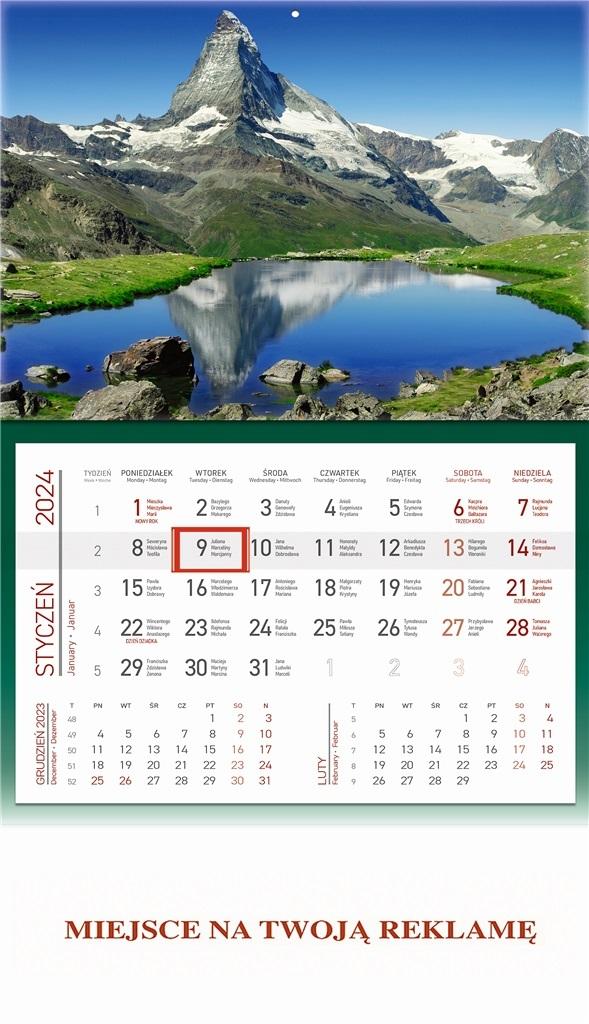 Kalendarz jednodzielny wiszący ścienny z kalendarium w układzie trzymiesięcznym z ozdobną główką, wypukłą i lakierowaną. Kalendarz jest składany do formatu A4. Istnieje możliwość zamówienia kalendarza zapakowanego w kopertę koloru kremowego. Plecki kalendarza dostępne w kolorze granatowym, zielonym, bordowym i szarym. Kalendarium ze zrywanymi kartkami. Istnieje możliwość wykonania nadruku reklamowego w dolnej części kalendarza.