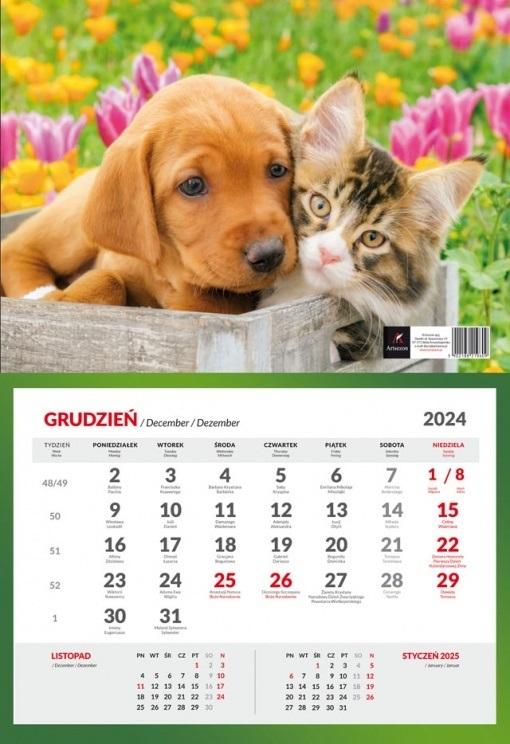 Dostępny w 12 wzorach wysyłanych losowo, kalendarium miesięczne + miniatury 2 miesięcy, główka kaszerowana, pasek PCV z okienkiem do zaznaczenia bieżącego dnia, rozmiar 51x35cm, eurodziurka do zawieszenia