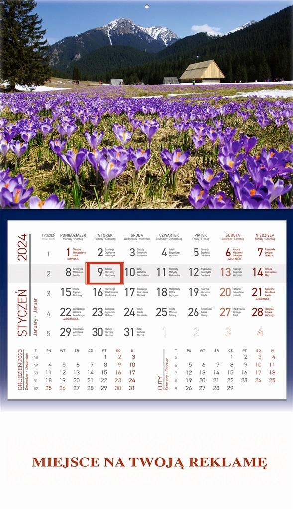 Kalendarz jednodzielny wiszący ścienny z kalendarium w układzie trzymiesięcznym z ozdobną główką, wypukłą i lakierowaną. Kalendarz jest składany do formatu A4. Istnieje możliwość zamówienia kalendarza zapakowanego w kopertę koloru kremowego. Plecki kalendarza dostępne w kolorze granatowym, zielonym, bordowym i szarym. Kalendarium ze zrywanymi kartkami. Istnieje możliwość wykonania nadruku reklamowego w dolnej części kalendarza.