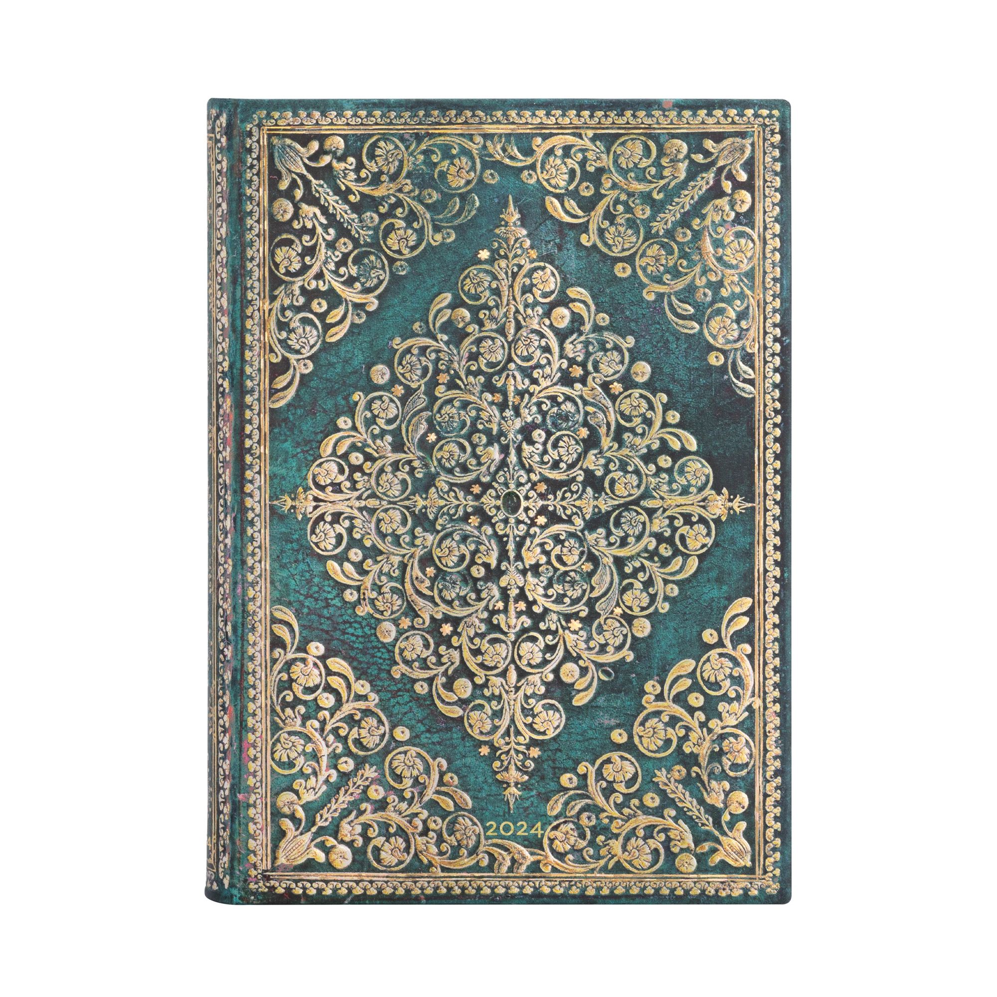 • Kalendarz ekskluzywnej marki Paperblanks. • Każdy dzień jest na osobnej stronie, soboty i niedziele są razem. • Oprawa twarda. • Kalendarium w języku angielskim. • W środku miejsce na notatki, roczny planer, oznaczone wybrane święta międzynarodowe, mini kalendarium, międzynarodowe numery telefonów, strefy czasowe. • Kalendarz posiada 2 satynowe wstążki jako zakładki. • Na końcu po wewnętrznej stronie okładki jest koperta na drobne notatki, wizytówki czy paragony oraz oraz mini skorowidz na adresy i telefony. • Papier ekologiczny, bezkwasowy, gramatura 80. • Zamknięcie na gumkę. • Wymiary 13 x18 cm. • 416 stron.