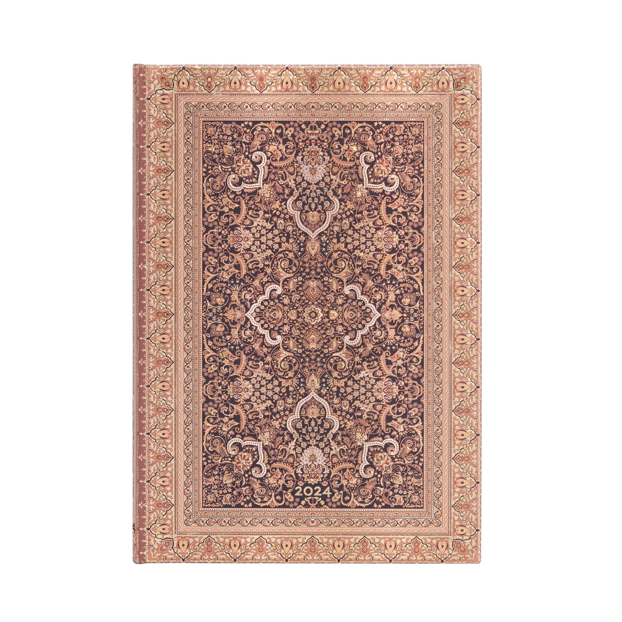 Kalendarz ekskluzywnej marki Paperblanks. Format midi typu horizontal - cały tydzień rozplanowany na 2 stronach. Oprawa twarda. Kalendarium w języku angielskim. W środku miejsce na notatki, roczny planer, oznaczone wybrane święta międzynarodowe, mini kalendarium, międzynarodowe numery telefonów, strefy czasowe. Kalendarz posiada 2 satynowe wstążki jako zakładki. Na końcu po wewnętrznej stronie okładki jest koperta na drobne notatki, wizytówki czy paragony oraz oraz mini skorowidz na adresy i telefony. Papier ekologiczny, bezkwasowy, gramatura 100. Zamknięcie na klapkę z magnesem. Wymiary 13 x 18 cm. 100 stron.