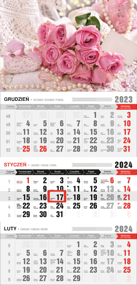 Opakowanie Kalendarz 2024 trójdzielny ekonomiczny z magnesem róże KTE VM-3