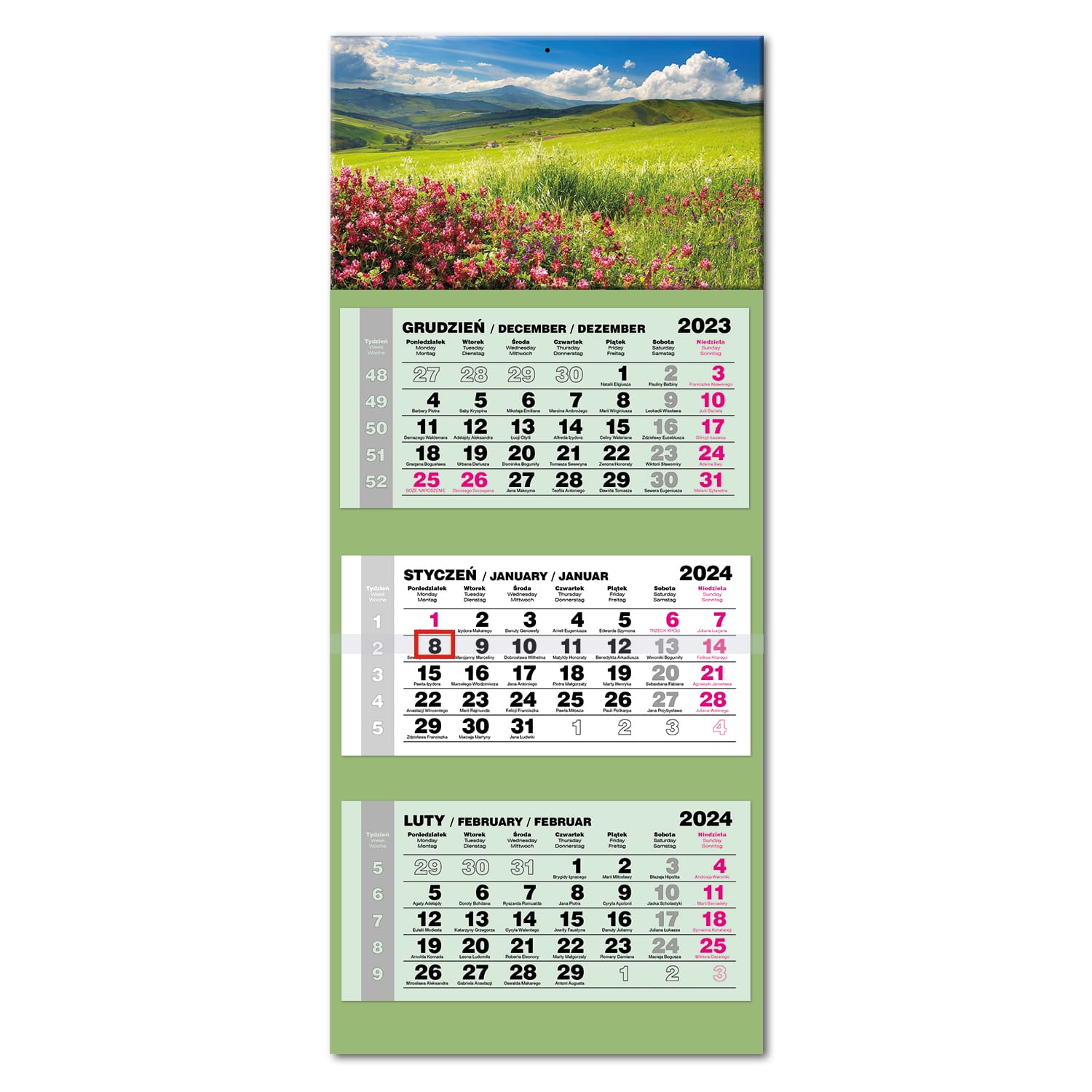 • Kalendarz ścienny, trójdzielny z główką wypukłą.