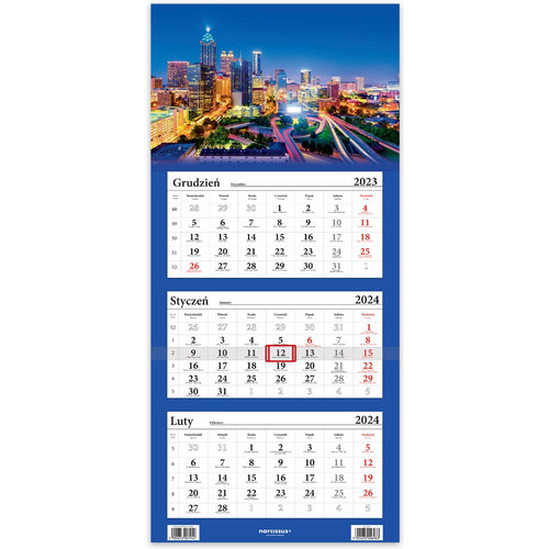 Klasyczny kalendarz trójdzielny na 2024 rok, podłużny, z opaską z przesuwnym okienkiem do zaznaczenia obecnego dnia. Kalendarz można złożyć w 3 miejscach. Zawiera 3 odrębne, zrywane kalendaria po 12 kartek. Kalendarz jest zapakowany w folię ochronną. Sposób zawieszania - otwór w górnej części. Wymiar złożonego kalendarza to 32 x 19 cm, a rozłożonego kalendarza to 32 x 67 cm. Wyprodukowano w Polsce.