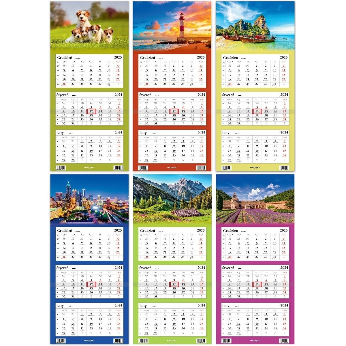 Klasyczny kalendarz trójdzielny na 2024 rok, podłużny, z opaską z przesuwnym okienkiem do zaznaczenia obecnego dnia. Kalendarz można złożyć w 3 miejscach. Zawiera 3 odrębne, zrywane kalendaria po 12 kartek. Kalendarz jest zapakowany w folię ochronną. Sposób zawieszania - otwór w górnej części. Wymiar złożonego kalendarza to 32 x 19 cm, a rozłożonego kalendarza to 32 x 67 cm. Wyprodukowano w Polsce.