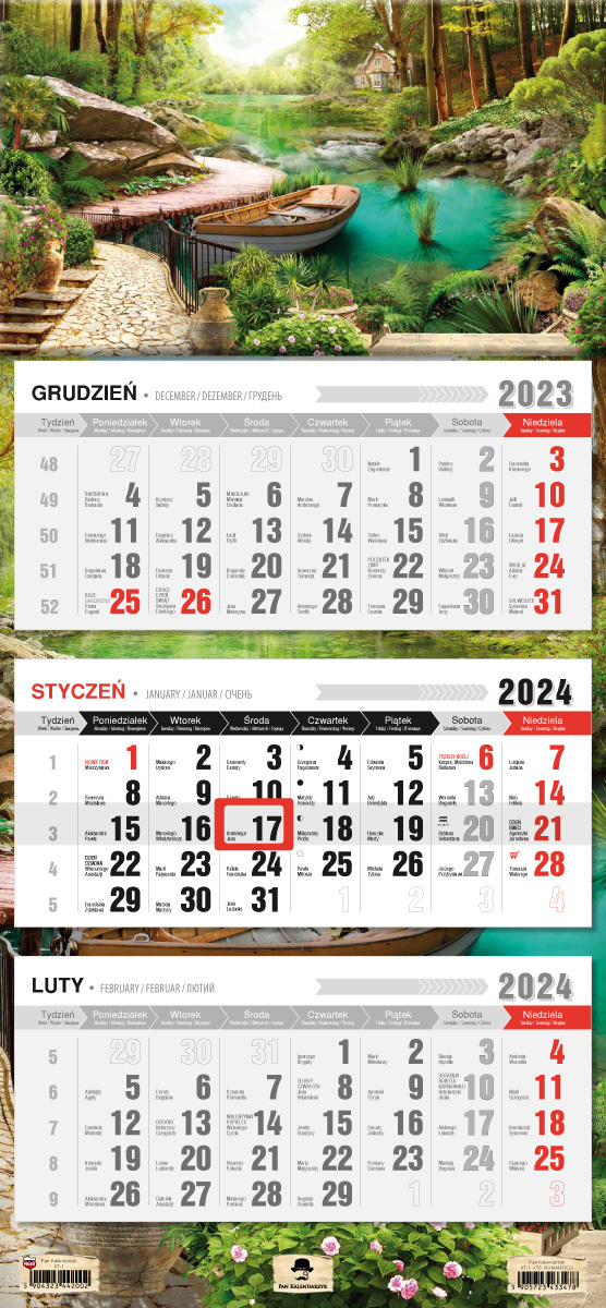 Kalendarz Trójdzielny z płaską główką. Format 315/680mm. Trzy komplety klasycznych kalendariów z przesuwnym okienkiem. Główka z otworem wierconym. Dodatkowo nazwy miesiąca i dni tygodnia w języku Ukraińskim, Angielskim i Niemieckim. Kalendarium dodatkowo zawiera fazy księżyca i znaki zodiaku. Dużo miejsca do notowania, czytelne duże litery i cyfry.