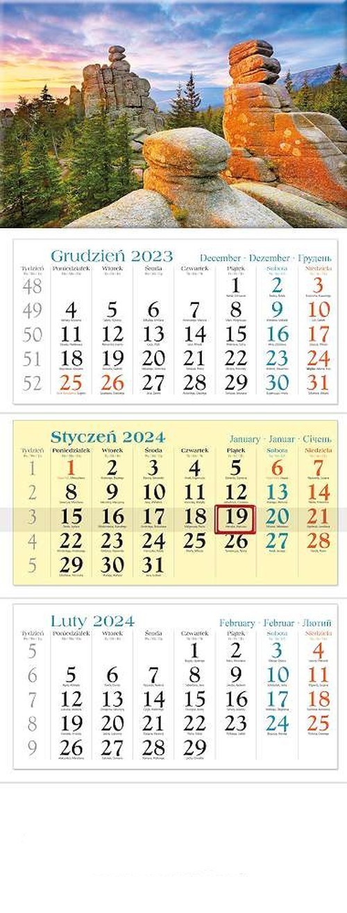 papier: główka karton 230 g/m2; plecy karton 300 g/m2; kalendarium papier offset 90 g/m2;