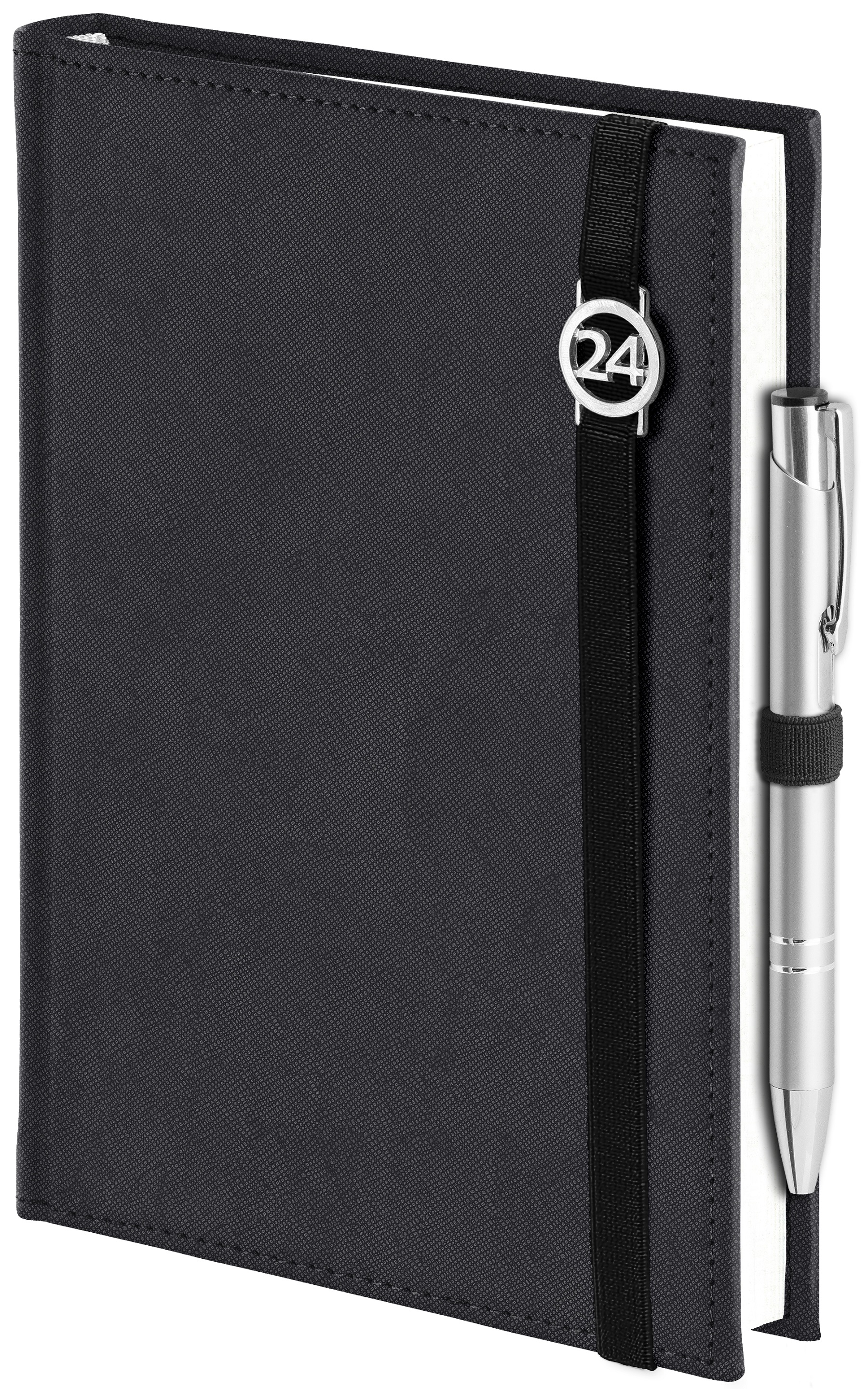 Kalendarz w oprawie Cross o drobnej fakturze z połyskiem. Brzeg okładki obramowany ozdobnym przeszyciem. Blok drukowany na białym kremowym; szyty nićmi; kapitałka i tasiemka żółte; przejrzysty układ graficzny kalendarium; rozbudowana część informacyjna; oprawa umożliwia wykonanie tłoczenia termicznego i grawera laserowego.