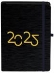 Kolekcja: Black · Format: A5 · Wymiary okładki: 144x210 mm · Układ: dzień na stronie · Ilość stron: 352 · Oprawa: twarda · Materiał: papier · Gramatura papieru: 80g · Kolor papieru: chamoise · Dodatki: plan roku 2025, ważne wydarzenia, skorowidz adresowy, notatki · Pionowa gumka zamykająca · Wstążka · Gumka na długopis · Zaokrąglone rogi: tak · Wyklejka: chamoise · Koperta: tak · Barwione brzegi na czarno