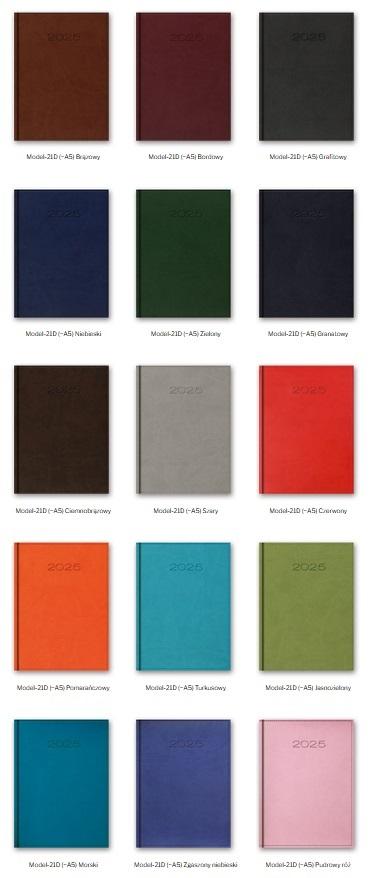 Specyfikacja szczegółowa Okleina skóropodobna, termoprzebarwialna, półmatowa, miękka i delikatna w dotyku; imitacja maszynowego przeszycia oprawy; pod tłoczenie suche oraz folią metalizowaną, nadruk tampondrukiem, sitodrukiem, nadruk UV, grawerowanie laserowe, znakowanie cyfrowe. Kalendarz w układzie dziennym (1 dzień na stronie). Najbardziej popularny format dla firm - A5 (blok: 14,5 x 20,5 cm), papier kremowy, druk szaro-bordowy, registry drukowane. Wstążka-zakładka; 336 stron; perforacja narożna; notes teleadresowy.