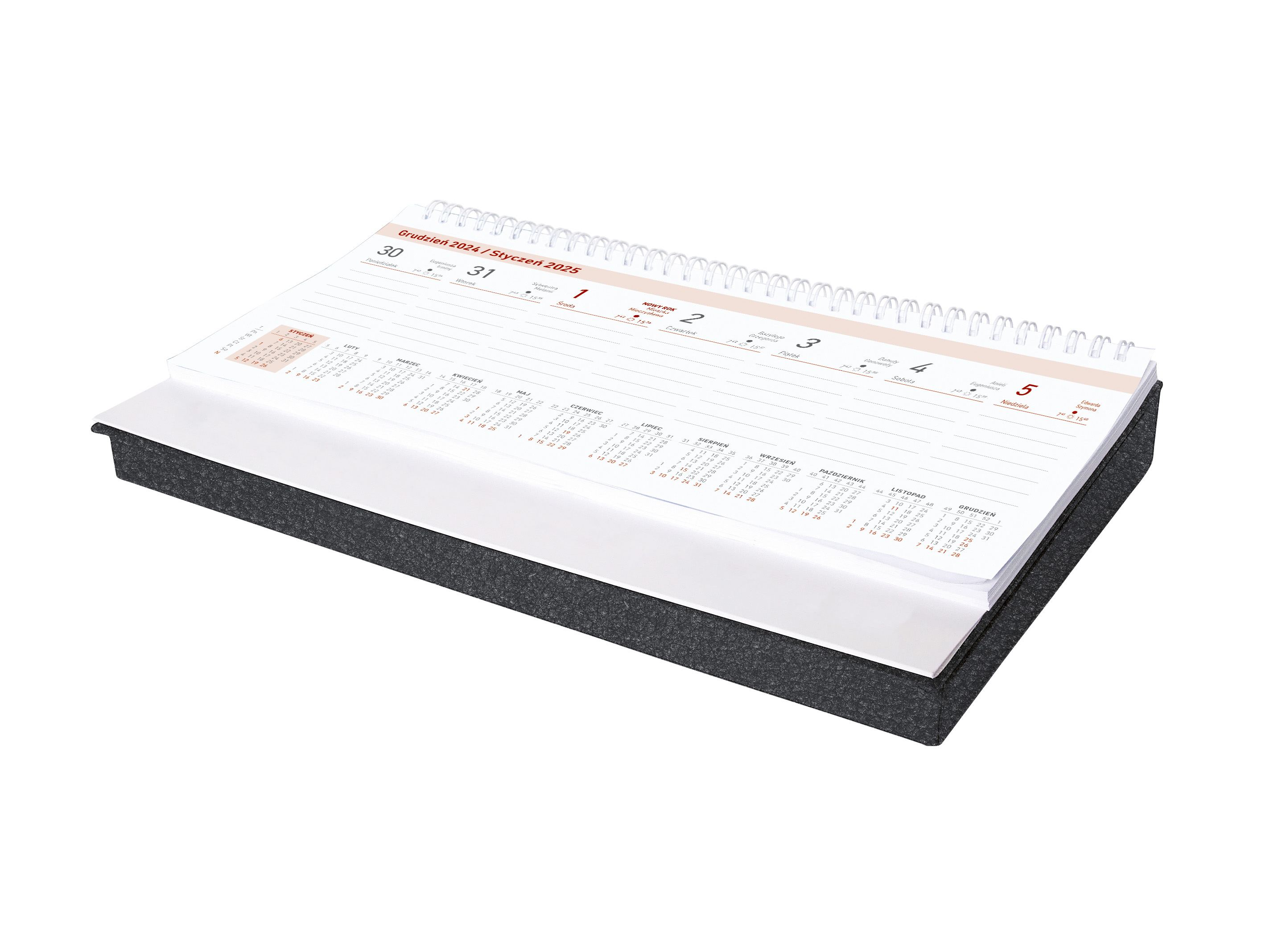 Praktyczny kalendarz biurkowy z piórnikiem z przejrzystym kalendarium w układzie tygodniowym, z dużym obszarem do notowania. Piórnik wykonany z tektury. Istnieje możliwość wykonania nadruku reklamowego pod kalendarium na obszarze o wymiarach 297 x 35 mm. Istnieje możliwość założenia indywidualnej okładki. W kalendarzu zaznaczono święta i daty imienin. W dolnej części kalendarium podgląd skróconego kalendarium bieżącego roku.