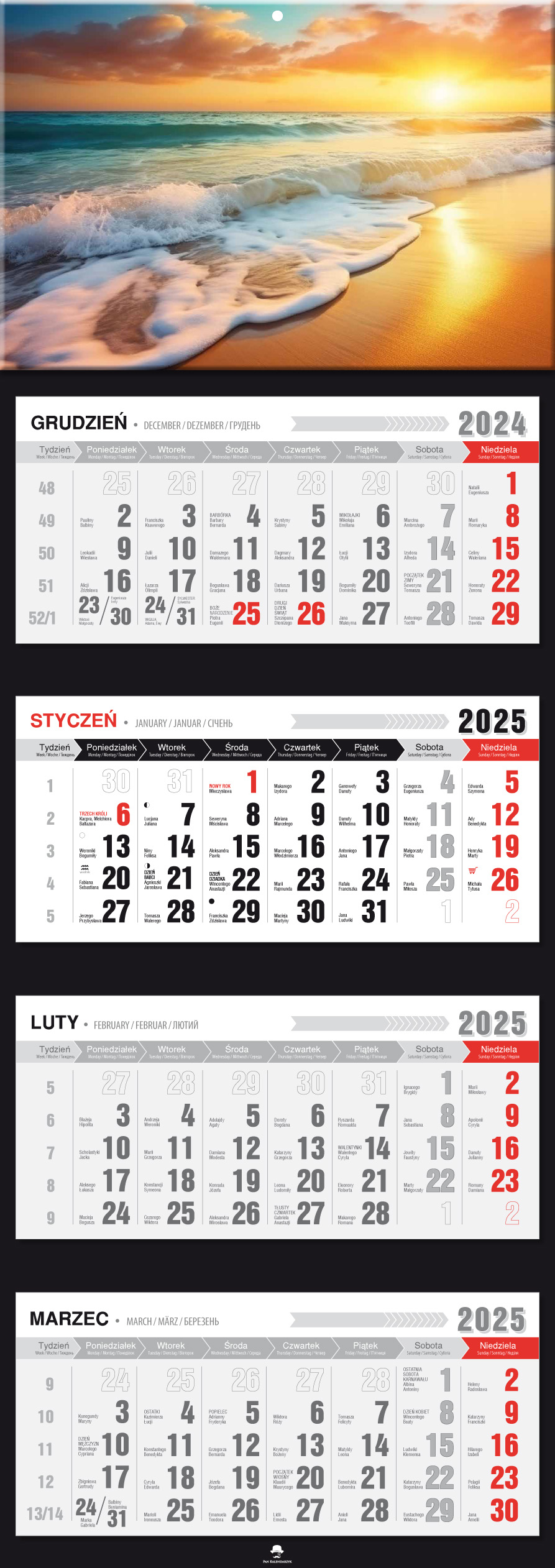 Kalendarz CZTERODZIELNY PREMIUM Z WYPUKŁA GŁÓWKĄ. Format 315/890mm. Cztery komplety klasycznych kalendariów z przesuwnym okienkiem. Główka z otworem wierconym. Dodatkowo nazwy miesiąca i dni tygodnia w języku Ukraińskim, Angielskim i Niemieckim. Kalendarium dodatkowo zawiera fazy księżyca i znaki zodiaku. Dużo miejsca do notowania, czytelne duże litery i cyfry.