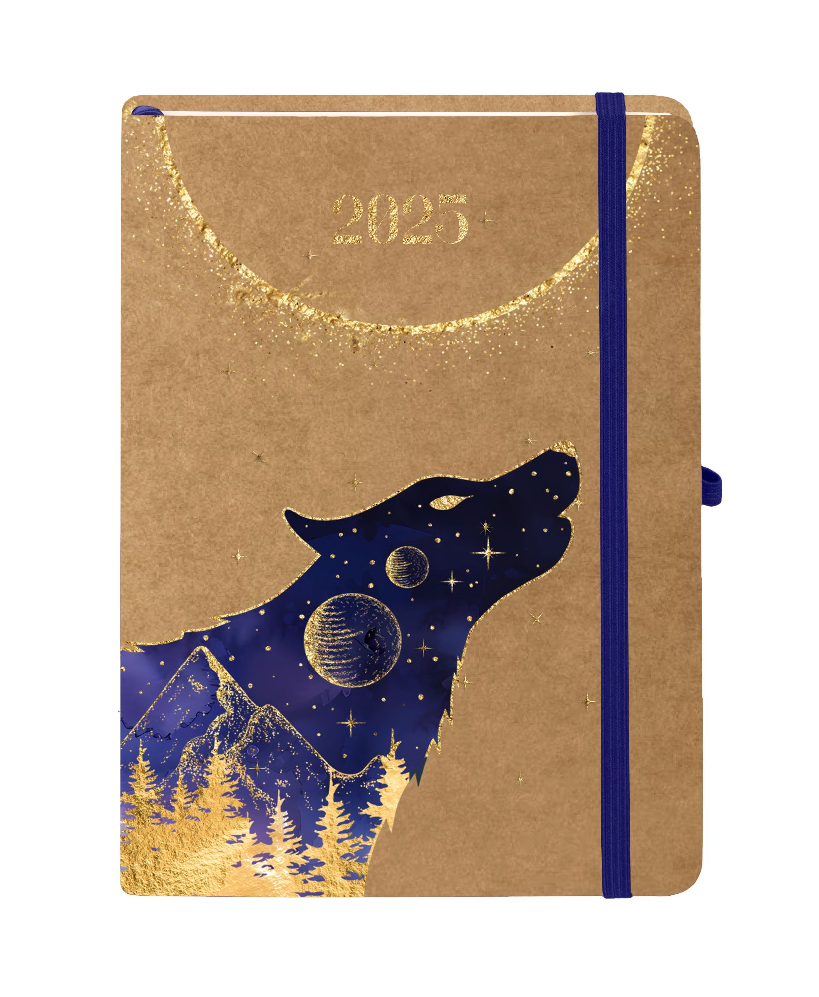 Kolekcja: Kraft, format: A5, wymiary okładki: 207x141 mm, układ: dzień na stronie, ilość stron: 352, oprawa: twarda, materiał: papier, gramatura papieru: 80g, kolor papieru: chamoise , dodatki: plan roku 2025, ważne wydarzenia, skorowidz adresowy, notatki, pionowa gumka zamykająca: czarna, wstążka: czarna, gumka na długopis: nie, zaokrąglone rogi: tak, wyklejka: czarna, koperta: nie, dostępne kolory: czarny, złoty