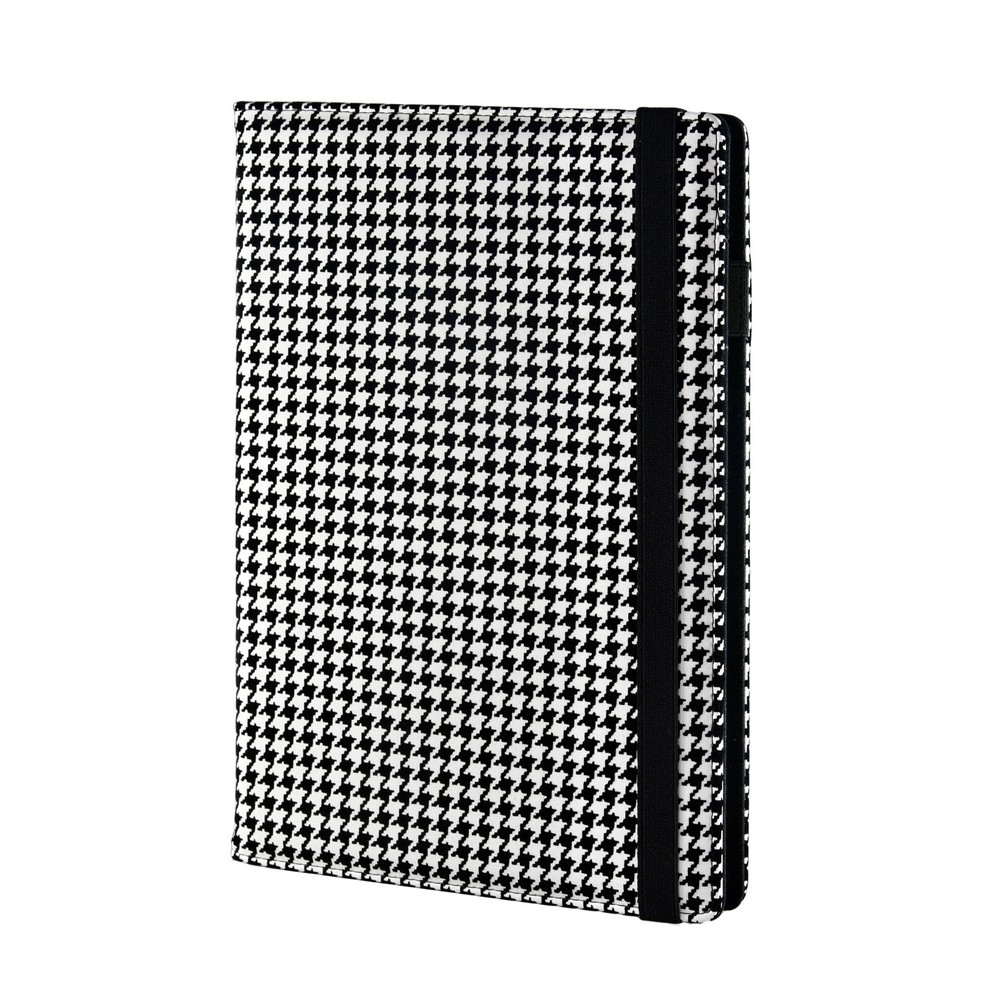 Okładka ręcznie wykonana z dwuwarstwowego poliuretanu. Zewnętrzna warstwa jest z zamszowego wypukłego zamszu przyjemnego w dotyku. Okładka jest w wersji kolorystycznej czarno-białej we wzór pepitka. Wnętrze wykończone czarnym zamszem.