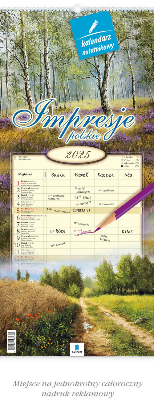 Specyfikacja kalendarza notatnikowego format kalendarza – 22 x 49 cm; kalendarz ścienny, 13-planszowy, z możliwością zrywania lub przekładania kart; Układ kalendarium specjalnie zaprojektowany do prowadzenia krótkich notatek kalendarium: bieżąca numeracja tygodni; cztery; wyszczególnione dni świąteczne: Dzień Matki, Popielec itp., fazy Księżyca, znaki Zodiaku (w zależności od wzoru); kalendarium w języku polskim, angielskim, niemieckim i ukraińskim; papier: środek – kreda mat 115 g/m2; okładka – kreda błysk 115 g/m2; plecy – 300 g/m2; druk: jednostronny, barwny; grzebień spirali w kolorze białym, z zawieszką; pod nadruk reklamowy: przedłużenie pleców z bigowaniem; pole pod jednokrotny, całoroczny nadruk reklamowy 9 x 22 cm; waga 1 egzemplarza – 200 g.