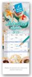 Specyfikacja kalendarza notatnikowego format kalendarza – 22 x 49 cm; kalendarz ścienny, 13-planszowy, z możliwością zrywania lub przekładania kart; Układ kalendarium specjalnie zaprojektowany do prowadzenia krótkich notatek kalendarium: bieżąca numeracja tygodni; cztery; wyszczególnione dni świąteczne: Dzień Matki, Popielec itp., fazy Księżyca, znaki Zodiaku (w zależności od wzoru); kalendarium w języku polskim, angielskim, niemieckim i ukraińskim; papier: środek – kreda mat 115 g/m2; okładka – kreda błysk 115 g/m2; plecy – 300 g/m2; druk: jednostronny, barwny; grzebień spirali w kolorze białym, z zawieszką; pod nadruk reklamowy: przedłużenie pleców z bigowaniem; pole pod jednokrotny, całoroczny nadruk reklamowy 9 x 22 cm; waga 1 egzemplarza – 200 g.