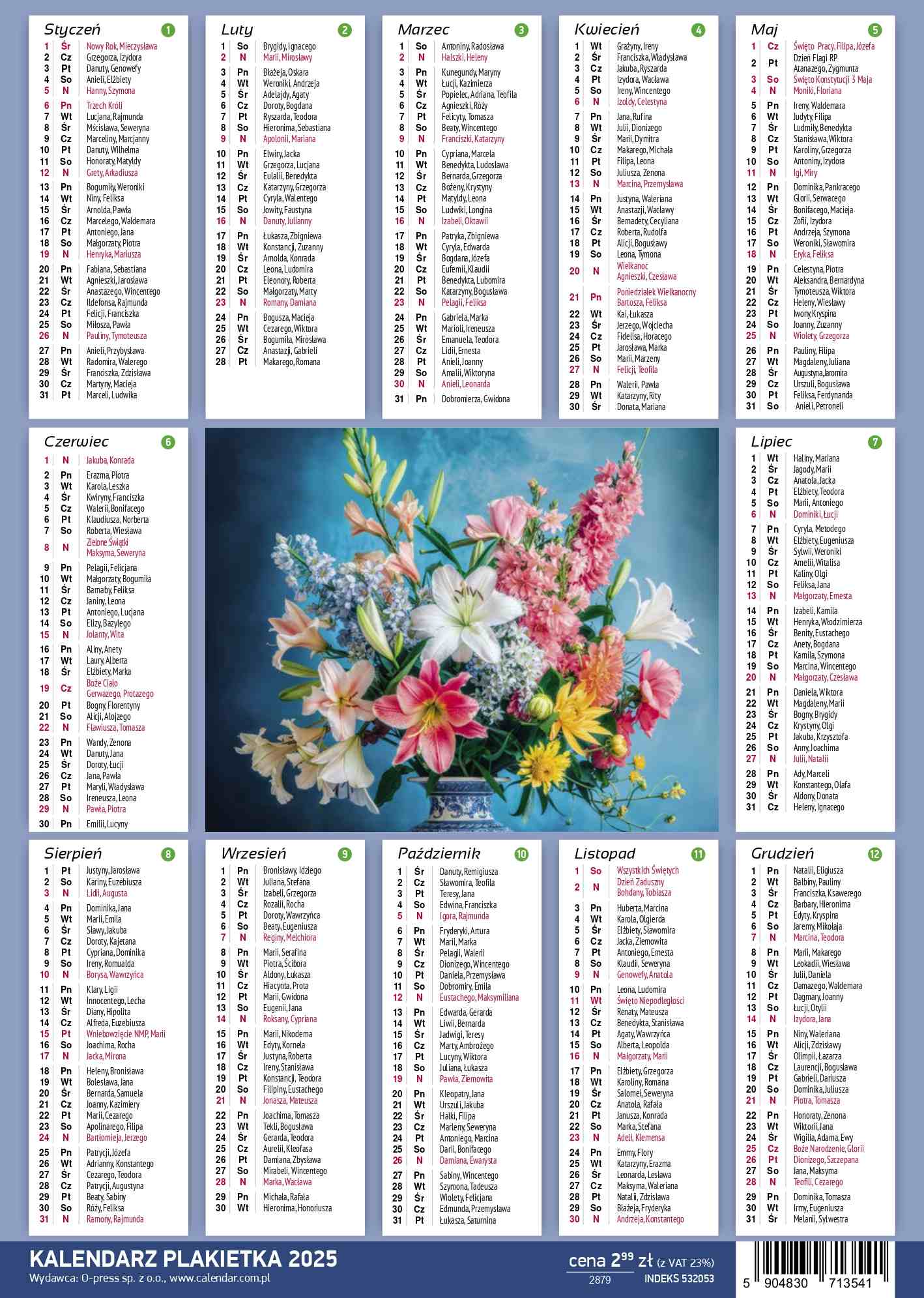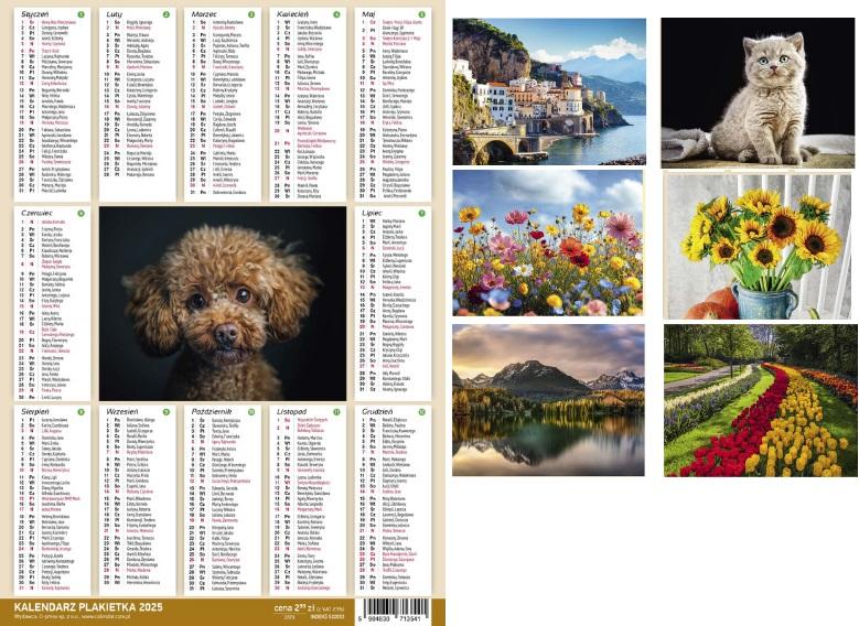 Praktyczny kalendarz Plakietka na rok 2025 w kompaktowym formacie 250x353 mm. Wszystkie miesiące umieszczone na jednej stronie, co umożliwia szybki przegląd całego roku. Zawiera dni tygodnia, święta oraz imieniny. Kalendarz jest ozdobiony uroczym zdjęciem, co nadaje mu wyjątkowego uroku. Dzięki czytelnemu układowi i prostemu designowi, jest idealny zarówno do biura, jak i do użytku domowego. Sprawdzi się również jako doskonały prezent. w kalendarzy