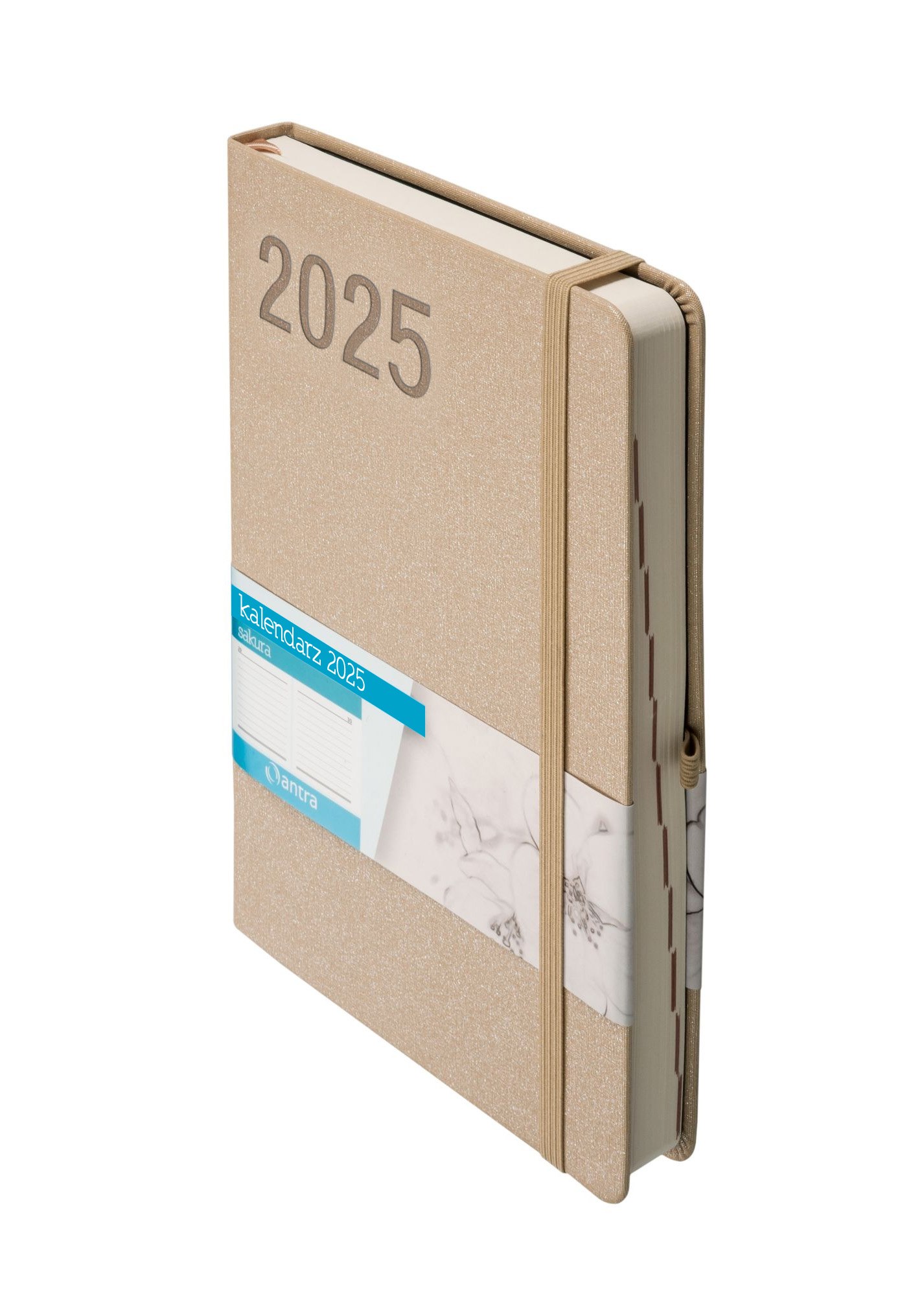 Kolekcja: Sakura · Format: A5 · Wymiary okładki: 210x145 mm · Układ: dzień na stronie · Ilość stron: 352 · Oprawa: twarda · Materiał: skóra ekologiczna, z błyszczącymi drobinkami · Gramatura papieru: 80g · Kolor papieru: off white · Dodatki: plan roku 2025, ważne wydarzenia, plan miesiąca, skorowidz adresowy, notatki · Pionowa gumka zamykająca: w kolorze okładki · Wstążka: w kolorze okładki · Gumka na długopis: w kolorze okładki · Zaokrąglone rogi: tak · Wyklejka: czarna · Koperta: tak