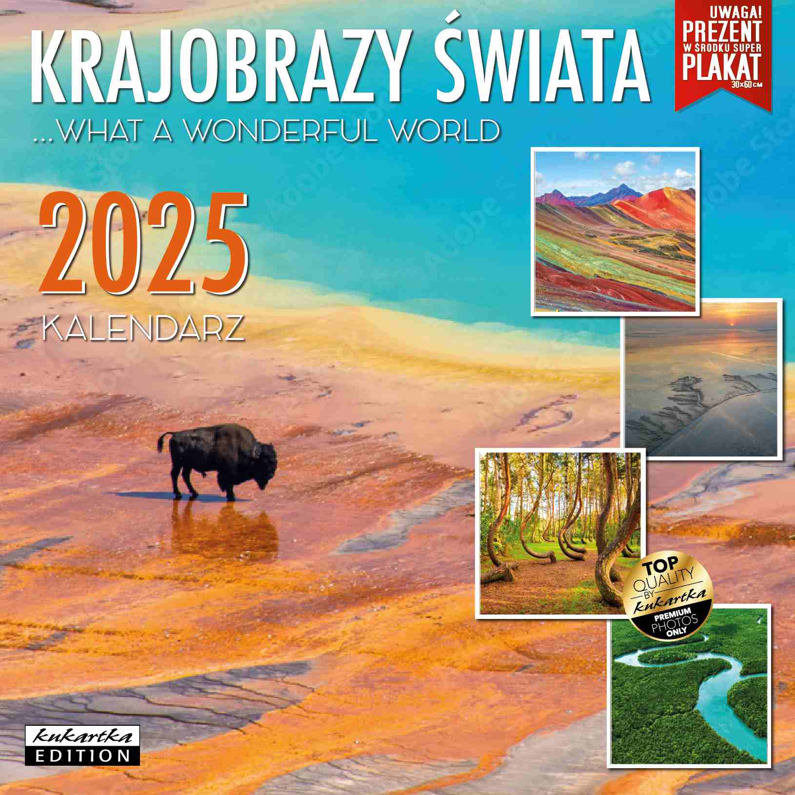 Kalendarz 2025 Krajobrazy Świata Kwadratowy kalendarz ścienny na rok 2025 z serii "Krajobrazy Świata". Każdy miesiąc cieszy pięknym zdjęciem, które będzie wspaniałą ozdobą Waszego domu. Kalendarz po rozłożeniu ma wymiary 30x60 cm - górny kwadrat wypełnia zdjęcie, a dolny kalendarium. PREZENT: w środku kalendarza znajdziecie plakat o wielkości 30x 60 cm! Specyfikacja: Wielkość: 30 x 30 cm (po rozłożeniu 30 x 60 cm) Gratis: plakat Styl: nowoczesny, klasyczny, zdjęciowy