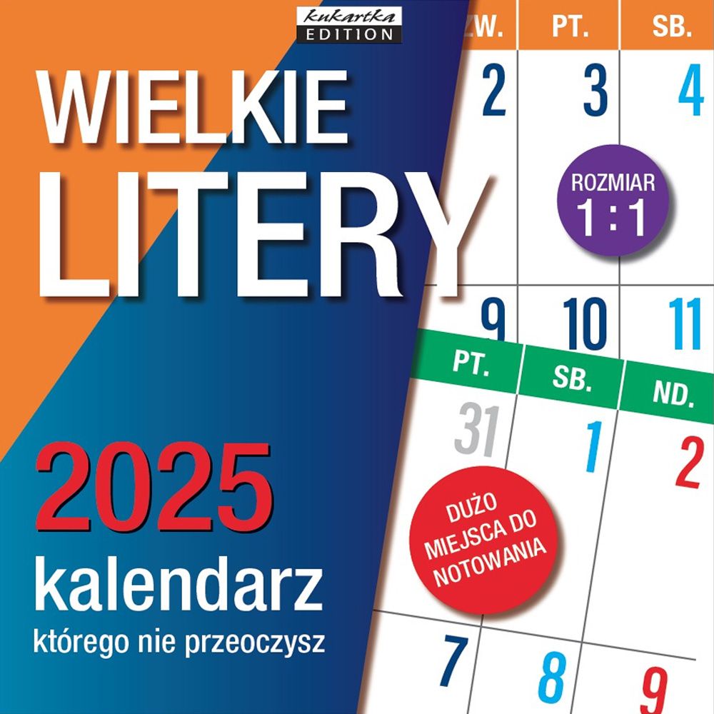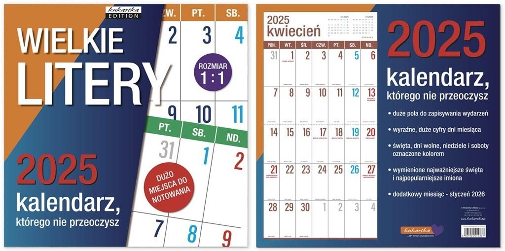 Kalendarz 2025 Wielkie litery Kukartka Kwadratowy kalendarz ścienny na rok 2025 z serii "Wielkie litery". Żadnego miesiąca nie przeoczysz - kalendarz składa się z wielkich liter. Znajduje się w nim dużo miejsca do notowania. Kalendarz po rozłożeniu ma wymiary 30x60 cm. Specyfikacja: Wielkość: 30 x 30 cm (po rozłożeniu 30 x 60 cm) Kalendarium: można po nim pisać Styl: cytaty, nowoczesny, klasyczny, zdjęciowy