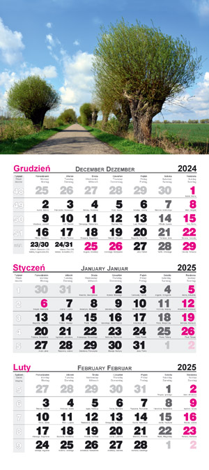 Kalendarz 2025 ścienny trójdzielny Wierzby