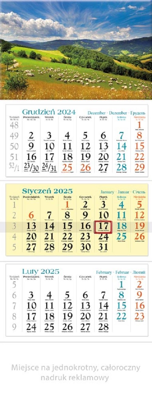 Specyfikacja kalendarzy trójdzielnych KT format kalendarza z "główką" i polem pod nadruk reklamowy 32 x 86 cm; kalendarze ścienne z całoroczną główką i zrywanymi kartami kalendarium; główka – format: 32 x 20 cm; oprawiona z efektem wypukłości, doklejona do pleców; kalendarium: trzy oddzielne bloczki (30 x 15 cm), doklejone do pleców; miesiąc bieżący wyróżniony kolorystycznie; podwójne imiona, bieżąca numeracja tygodni; kalendarium w języku polskim, angielskim, niemieckim i ukraińskim wysokość cyfr w głównym kalendarium: 14 mm papier: główka – karton 230 g/m2; plecy – karton 300 g/m2; kalendarium – papier offset 90 g/m2; druk: zdjęcie – jednostronny barwny + lakier UV błysk; kalendarium – jednostronny, barwny; pasek regulowany z czerwonym okienkiem; pod nadruk reklamowy: przedłużenie pleców poniżej kalendarium, z bigowaniem; brak możliwości nadruku pomiędzy kalendariami (ze względu na bigowanie); pole pod jednokrotny, całoroczny nadruk reklamowy: 32 x 12 cm; waga 1 egzemplarza – 350 g