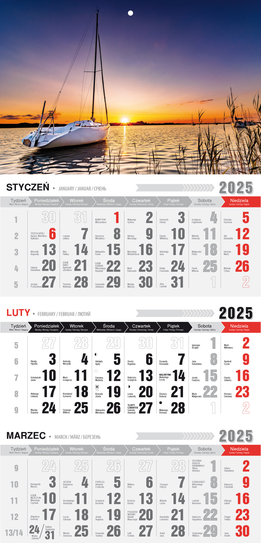 Kalendarz Trójdzielny Ekonomiczny JEDNOPLANSZOWY z przesuwnym okienkiem. Format 300/623mm. Główka z otworem wierconym . Dodatkowo nazwy miesiąca i dni tygodnia w języku Ukraińskim, Angielskim i Niemieckim. Kalendarium dodatkowo zawiera fazy księżyca i znaki zodiaku. Dużo miejsca do notowania, czytelne duże litery i cyfry. 12 kart do zrywania.