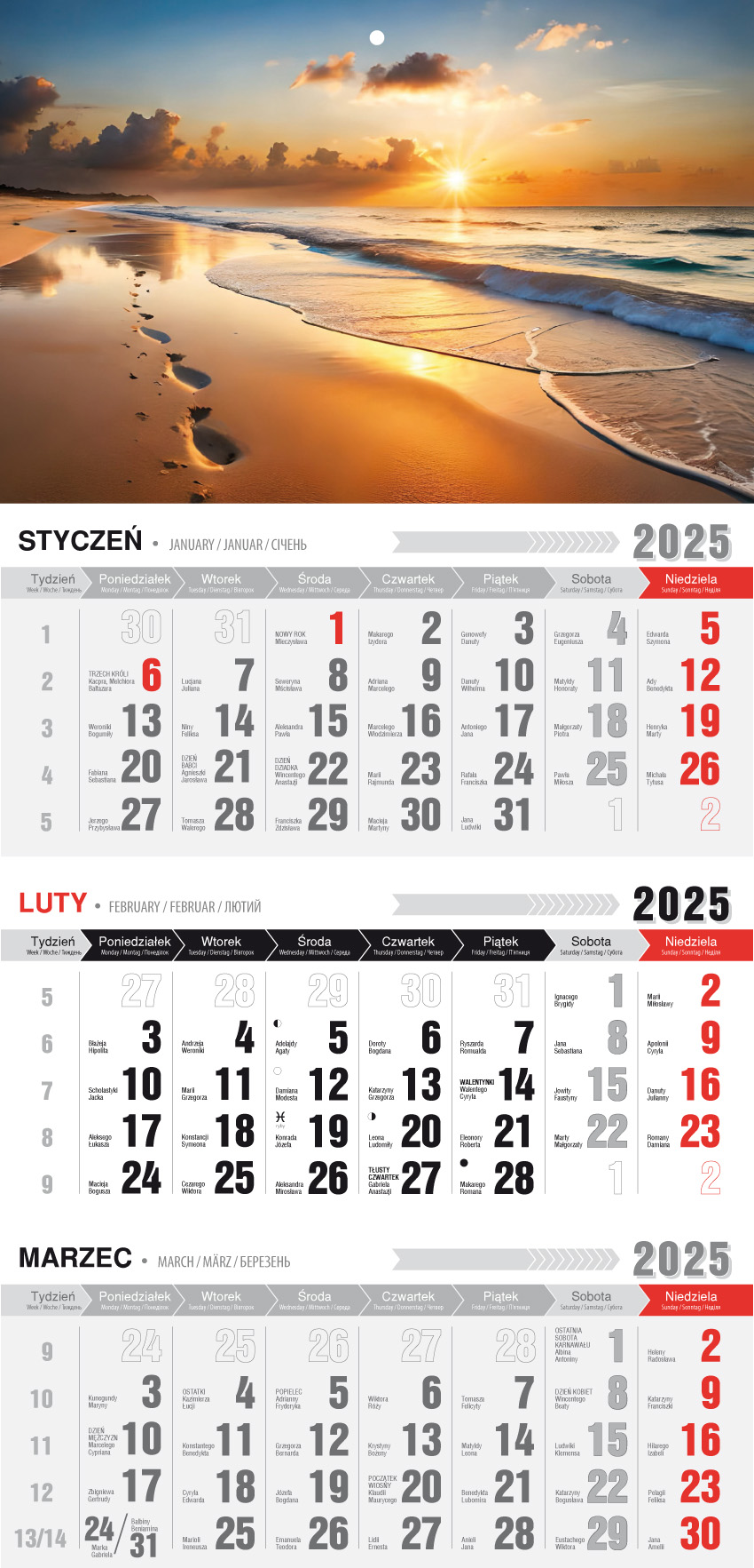 Kalendarz Trójdzielny Ekonomiczny JEDNOPLANSZOWY z przesuwnym okienkiem. Format 300/623mm. Główka z otworem wierconym . Dodatkowo nazwy miesiąca i dni tygodnia w języku Ukraińskim, Angielskim i Niemieckim. Kalendarium dodatkowo zawiera fazy księżyca i znaki zodiaku. Dużo miejsca do notowania, czytelne duże litery i cyfry. 12 kart do zrywania.